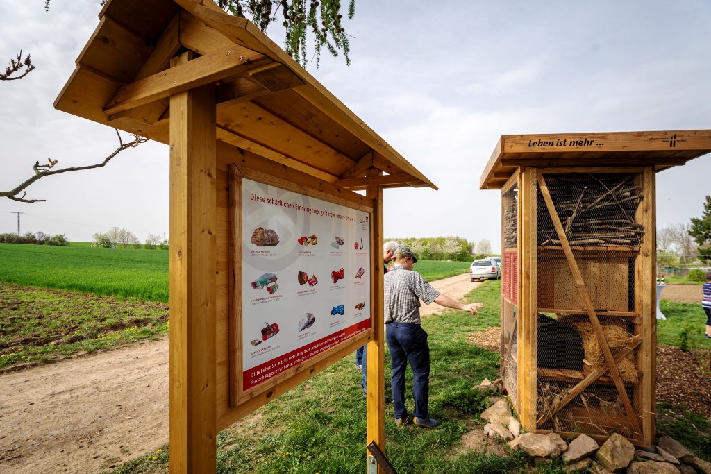 Seit Anfang April hat Egstedt einen Lebensturm. Er soll Heimstatt für vieles werden, was da so kreucht und fleucht: Insekten, Igel, kleine Amphibien. Er steht oberhalb der Rodelbahn umgeben von Feldern, Gärten, Sträuchern, Bäumen und Wiese. Ein idealer Standort. Gebaut wurde er von Menschen mit Behinderung des Christophoruswerkes Erfurt in deren Holzwerkstatt. Er hat neben einem Erdgeschoss, das für Igel gedacht ist, vier Etagen, die mit Schilf und Stroh, Kästen für Hummeln, Holzteilen mit kleinen Öffnungen und Geäst gefüllt sind. Ein begrüntes Dach mit Blühendem soll ebenfalls fliegende Gäste anlocken.